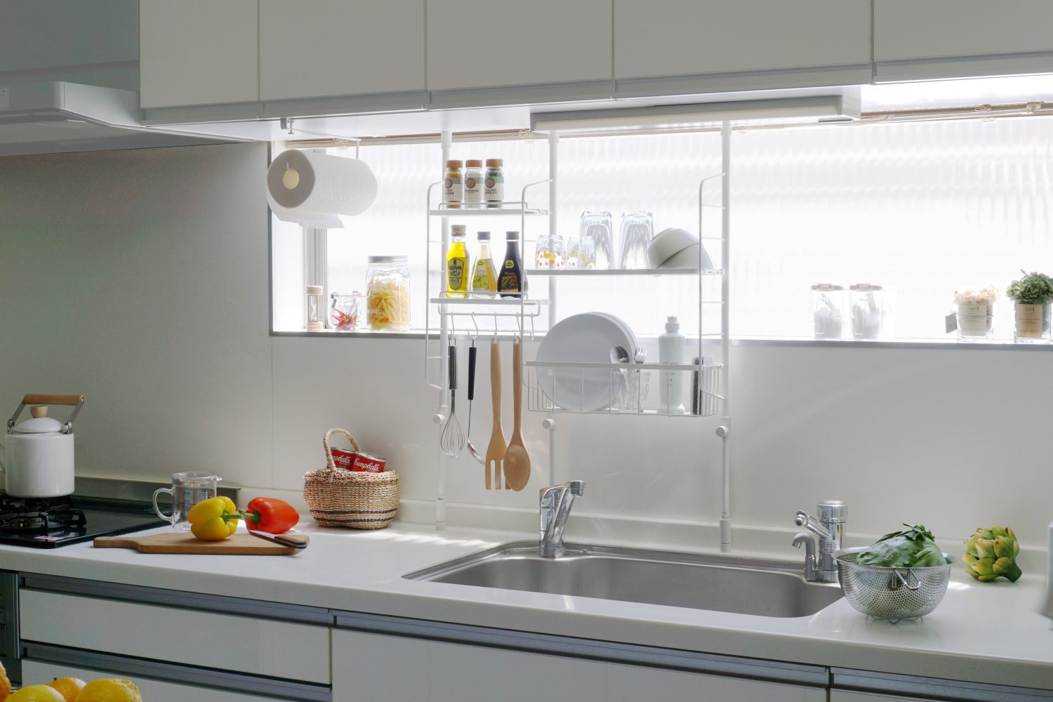 一般櫥櫃與工作檯面間距離不大、且都是平整面加上收納層架、置物籃再搭配活動掛勾(建議使用專用伸縮桿,增強耐重力),就可以完美無痕利用壁面儲物,使收納再升級。