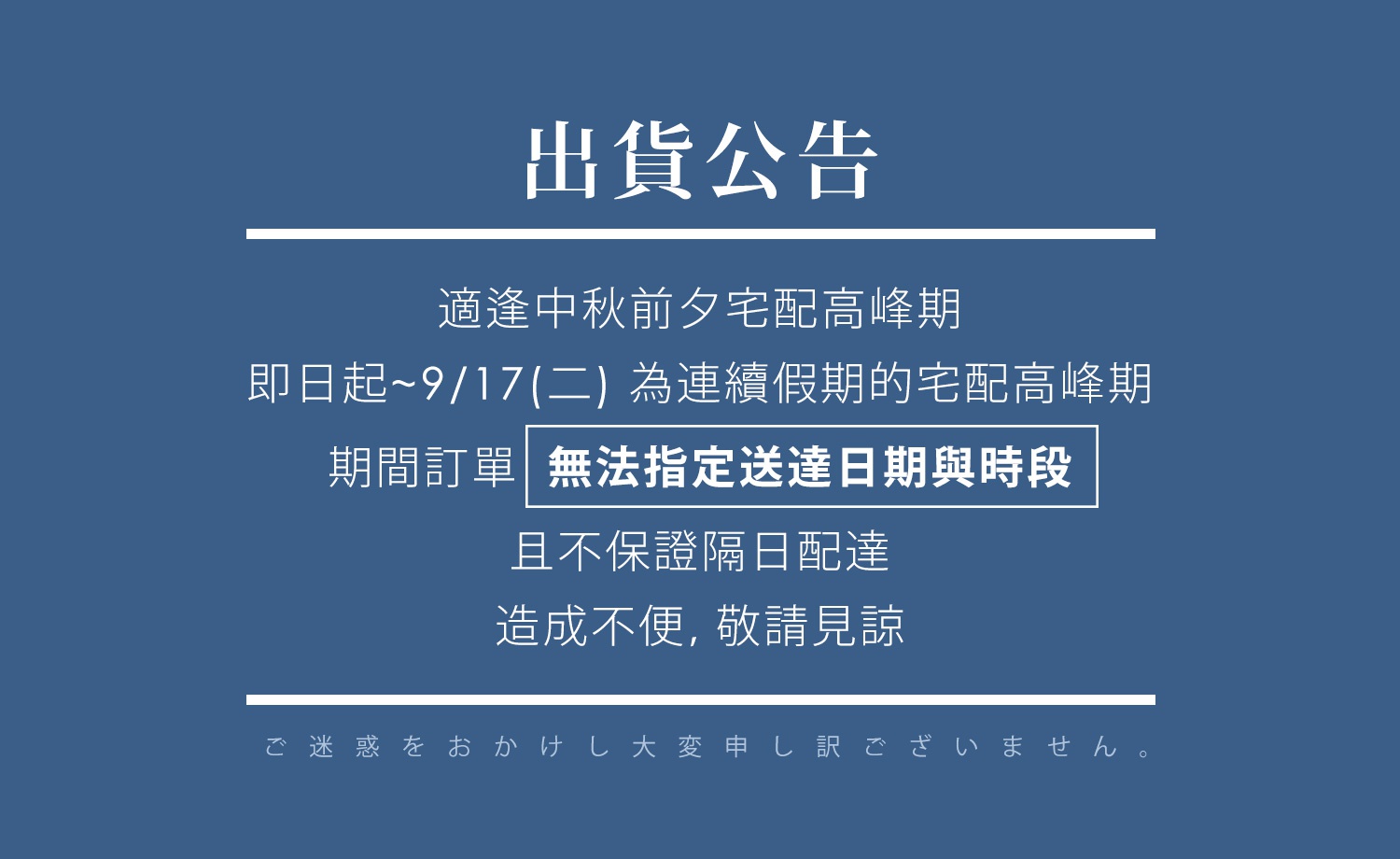 即日起~9/17(二)為連續假期的宅配高峰期