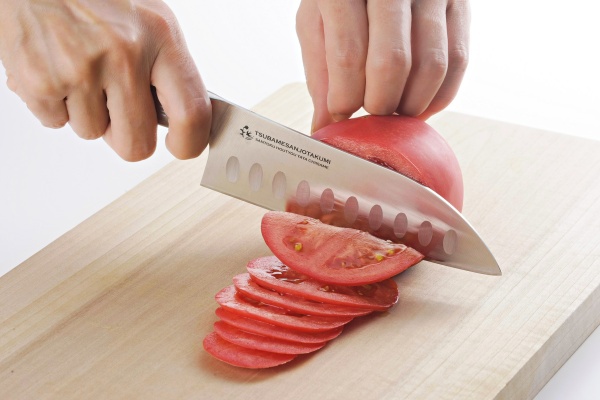 這把刀的刀刃採用了「凹槽」加工,讓我們在切菜時能夠輕鬆切斷食材,不易黏在刀刃上。
