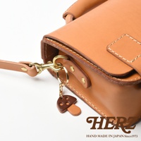 職人手作皮革香菇造型鑰匙圈,由兩塊淺棕色皮革組成香菇造型,傘蓋上方有三個深棕色皮革圓點裝飾,搭配金色金屬掛環與鉤扣,掛於淺棕色皮革包的提把上。