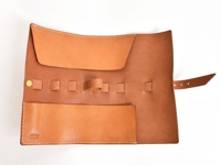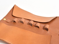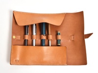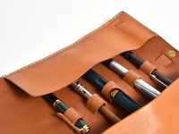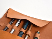 焦糖色皮革捲捲筆袋,配有黃銅扣環及皮帶,側邊及邊緣有白色車線。筆袋旁攤開的棕色皮革筆簾內有數支筆,左側有一疊白色紙張及一支藍色鋼筆。