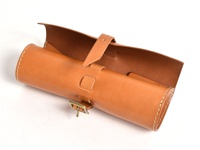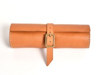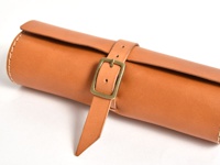 職人手作皮革捲捲收納筆袋 (KP-100),原色皮革,附有古銅色針扣皮帶固定,邊緣縫線清晰。