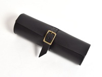 職人手作皮革捲捲收納筆袋,黑色皮革製成,帶有黃銅色帶扣和皮帶,用於固定捲起的筆袋。