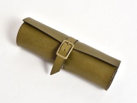 職人手作皮革捲捲收納筆袋,橄欖綠色,採用真皮材質,搭配金色金屬釦環,設計簡約實用。