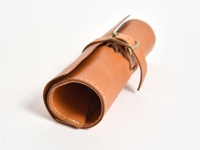 職人手作皮革捲捲收納筆袋,採用光滑淺棕色皮革製成,整體呈圓筒狀,以皮革帶固定。