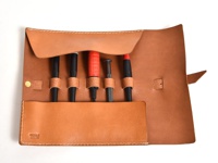 淺棕色皮革捲捲收納筆袋,內有四支筆,其中一支為紅色握把,袋口有金屬壓扣,皮革上印有品牌標誌。