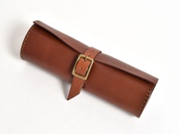 棕色皮革捲捲收納筆袋,附有皮帶及金屬扣環,邊緣縫線明顯。