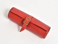紅色皮革捲捲筆袋,附有金色皮帶扣,用於固定,邊緣有縫線。