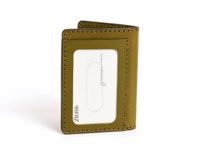 橄欖綠皮革製成的手工三折票券收納夾,設有透明證件夾層,邊緣有縫線細節,品牌標誌印於證件夾層內。