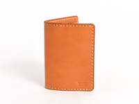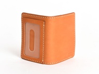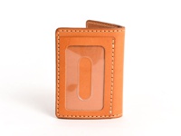 職人手作皮革三面雙折票券收納夾,淺棕色皮革,內裡橘棕色,附有透明證件夾層,整體縫線為淺色。