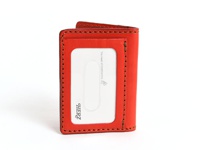 亮紅色皮革三面雙折票券夾,正面有一個透明卡套,並飾有品牌標誌和手工縫線。