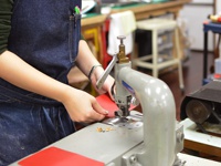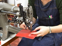 一台工業縫紉機正在縫製紅色皮革製品,一位身穿丹寧圍裙的女士正在操作。