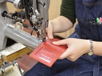 職人手作紅色皮革三面雙折票券收納夾,夾內有兩個透明夾層,正在工業縫紉機上進行縫製。