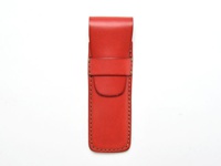紅色皮革鋼筆收納筆套,有縫線裝飾,帶有翻蓋和皮帶扣。