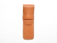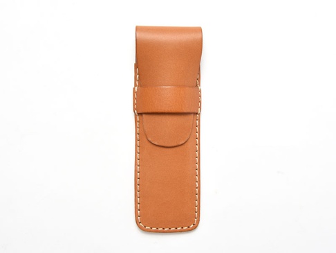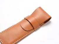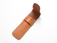 淺棕色皮革製單支鋼筆收納筆套,帶有手工縫線,筆套頂部有一條翻蓋式固定帶,內側有壓印品牌標誌。