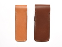 兩件皮革鋼筆收納筆套,左為淺棕色,右為深棕色,均採用縫線工藝,設計簡約。