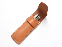 淺棕色皮革製成的鋼筆收納筆套,帶有壓扣式封口和對比色的縫線,設計簡潔。