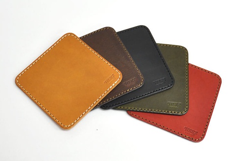 五塊方形皮革印章墊板,顏色包含淺棕色、深棕色、黑色、橄欖綠和紅色,皆為職人手作,邊緣以白色縫線處理,角落壓印有「HERZ」品牌標誌。
