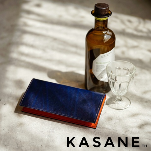 KASANE 品牌午夜藍Rugato皮革長夾,內裡為橘棕色植鞣牛皮,展現精湛手工縫線細節。
