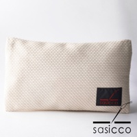 三河木綿刺子織文件收納包,黑色 logo 標誌,包含針線與品牌名稱「sasicco」。