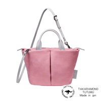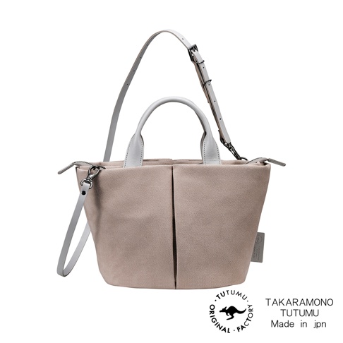 TUTUMU 品牌粉紅色絨面皮革托特包,配有白色皮革手柄和可拆卸斜挎帶,包包上印有 TUTUMU 和 TAKARAMONO TUTUMU Made in jpn 字樣。