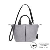 TAKARAMONO TUTUMU 品牌 Suede Marche petit 灰色絨面皮革兩用單肩包,配有黑色手柄和肩帶,側面有縫線設計,底部右側有黑色品牌標籤,下方為品牌標誌和產地標示。