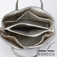 黑白格紋三河木綿刺子織多口袋托特包,配有兩條提把,側面有外袋,內部為米白色布料。