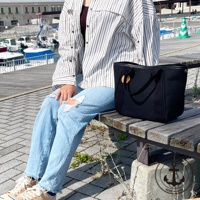 黑色帆布手提托特包,配有黑色織帶提把,包身側面有黑色皮革裝飾,包上掛有圓形木質吊飾,上面刻有船錨圖案。