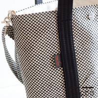 三河木綿刺子織兩用水桶包,織紋為黑白格紋,搭配黑色提把與底部,簡約實用。