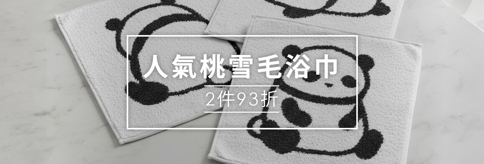 幾條印有可愛熊貓圖案的淺灰色毛巾平放在大理石紋桌面上,毛巾上方疊加著說明文字,介紹這是人氣桃雪毛巾,且享有購買兩件即享折扣的優惠活動。