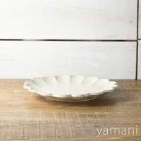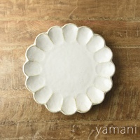 一個 24 公分、白色、帶有六瓣花型邊緣的陶瓷主食盤,表面有細微的紋理,盤底有「yamani」品牌標誌,置於木紋背景上。