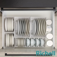 抽屜式餐盤收納架整齊擺放白色盤子和碗,部分有Richell品牌標誌