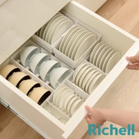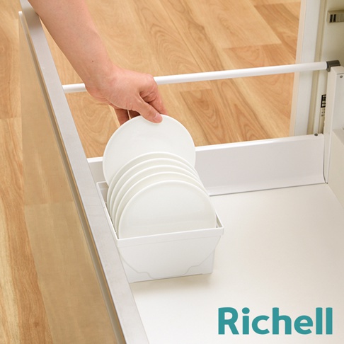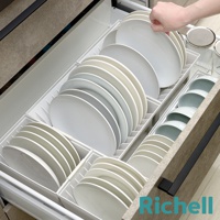 抽屜式餐盤收納架整齊擺放著白色盤子和碗,部分盤子有淺褐色紋理,旁邊還有三個圓形罐子,右下角有Richell品牌字樣。