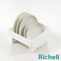 抽屜式餐盤收納架整齊擺放白色盤子和碗,部分有Richell品牌標誌