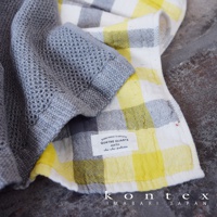 一款灰色的網狀織紋毛巾蓋在一條黃色和灰白色格紋的毛巾上,下方有一張標籤,上面寫著 KONTEX IMABARI JAPAN。