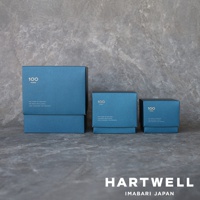 三款深藍色紙盒,分別印有白色「100 HYAKU」字樣及英文說明,精緻包裝呈現。