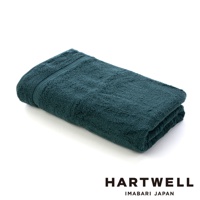 一件深灰色、觸感柔軟的毛巾,織有細緻的紋理,左側繡有「100」字樣的布標,右側有紅、白、藍條紋的裝飾,底部印有「HARTWELL IMABARI JAPAN」字樣。