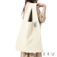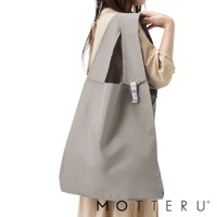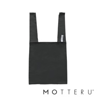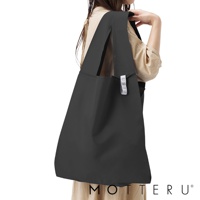 這是一個黑色的大容量摺疊環保隨行袋,由輕質尼龍材質製成,有兩個長提把,左側提把上縫有白色標籤,印有「MOTTERU」字樣。