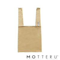淡黃色大容量摺疊環保隨行袋,布料材質,具有兩個肩背帶,袋身方形,右肩帶上有灰色織標,織標上印有白色「MOT」字樣。