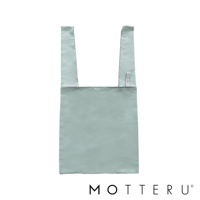 展示一個灰色的大容量摺疊環保隨行袋,由柔軟材質製成,配有寬大的提把。另一隻手展示一個摺疊起來的淺綠色隨行袋,用帶有「MOT」字樣的彈性綁帶固定。