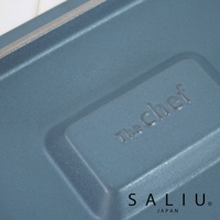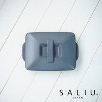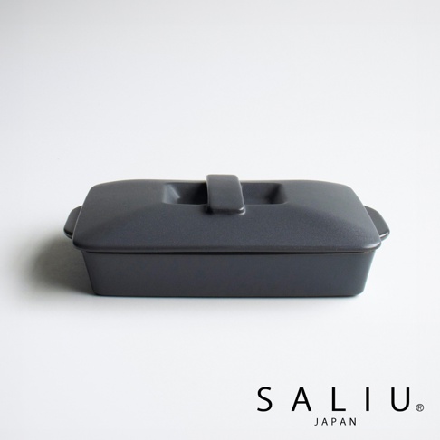 The chef 多功能耐熱陶製萬用長方形附蓋烤盤 S-平底。烤盤為灰色陶製,帶有「The chef」、「SALIU」、「JAPAN」壓印字樣。烤盤邊緣和把手為深灰色。