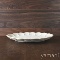 六魯粉引花型橢圓料理盤,米白色陶瓷材質,邊緣有花瓣狀凹凸紋理,盤面有乾燥黃花束裝飾。