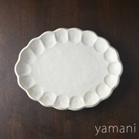 六魯粉引花型橢圓料理盤,米白色陶瓷材質,邊緣有花瓣狀凹凸紋理,盤面有乾燥黃花束裝飾。