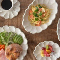 六魯粉引花型橢圓料理盤,白色陶瓷,帶有花瓣狀邊緣,盛有義大利麵、燻鮭魚、水菜、檸檬片,以及包含小黃瓜、豆芽、酪梨、麵包、火腿、水果的另一組料理。