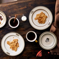 美濃燒葉紋復古溫潤主食深盤,盤面為白色,邊緣有復古棕色線條裝飾,盤身飾有葉紋圖案,其中兩個盤子中盛有杏仁脆片,一旁擺放著咖啡杯與奶盅。