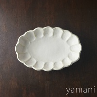 一個白色、帶有花瓣狀邊緣的橢圓形陶瓷料理盤,盤面中央平坦,邊緣有手工製作的紋理感。