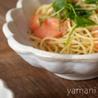 六魯粉引花型橢圓料理盤,盛裝著義大利麵,盤緣帶有花瓣狀的白色陶瓷,整體呈現樸實的日式風格。