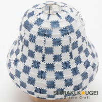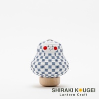 一群印有藍色棋盤格圖案的紙質達摩不倒翁迷你提燈,部分提燈飾有可愛的動物臉孔,底部為木製基座,背景為白色。