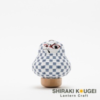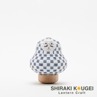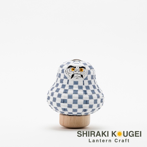 達摩不倒翁迷你提燈,白色紙質燈籠身印有藍色棋盤格紋,臉部描繪黑色眉毛、鬍鬚及橙色眼睛。提燈置於圓形木質底座上。