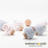 六個達摩不倒翁迷你裝飾提燈,有藍白格紋、粉色櫻花圖案,以及臉部表情各異。提燈底部為木質圓形座,右側另有一顆木質圓球。